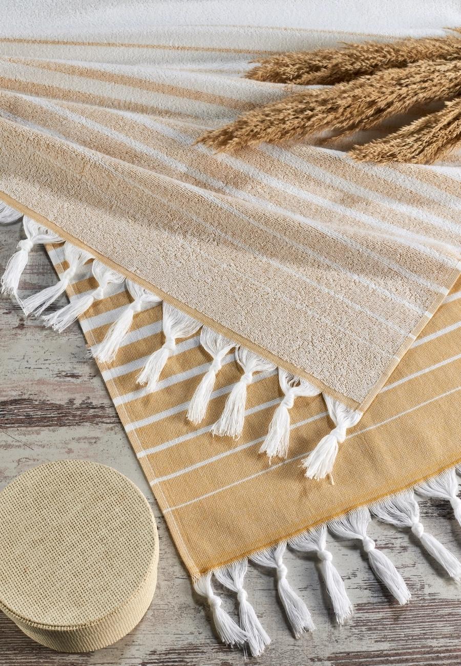Handduken finns tillgänglig i fyra tidlösa färger: gul, blå, beige och rosa.
